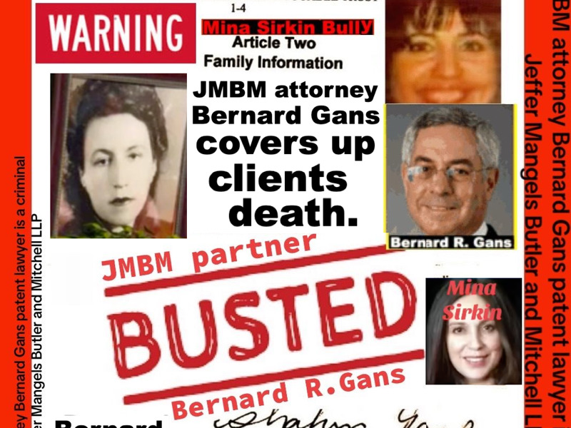 Suing JMBM partner $500,000,000,000.00 Busted criminal attorneys Jeffer Mangels Butler & Mitchell LLP lawyer Bernard Reginald Gans #57068 Bernard Gans Mina Sirkin law group JMBM killed my mom to get her fortune.Suing JMBM partner $500,000,000,000.00 Busted criminal attorneys Jeffer Mangels Butler & Mitchell LLP lawyer Bernard Reginald Gans #57068 Bernard Gans Mina Sirkin law group JMBM killed my mom to get her fortune.